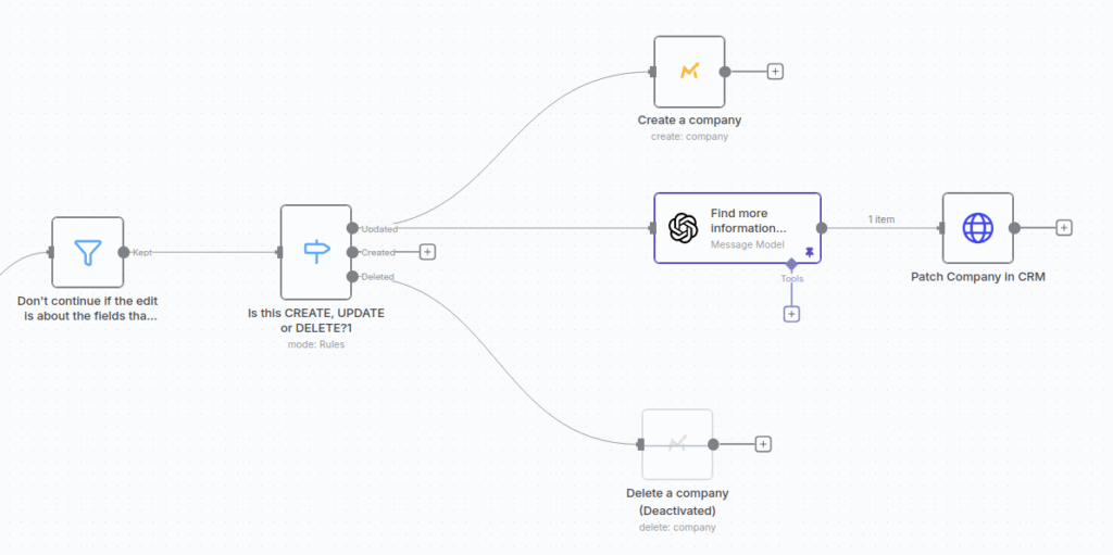 In the second example, we enrich the data in our internal CRM system by asking ChatGPT what it knows about a company. After chatgpt’s reply, we store the information in our transactional system.